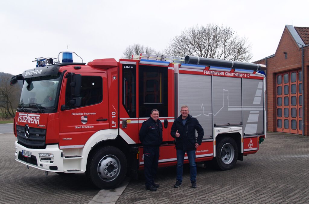 Hier wurden Sie von ihren Kameraden und Bürgermeister Andreas Insam empfangen. Damit ging eine lange Planungs‑ und Bauphase zu Ende: Rund zweieinhalb Jahre vergingen von der Auftragserteilung bis zur finalen Übergabe in Giengen an der Brenz. Das LF 10 verfügt über einen 2000‑Liter‑Wassertank und ist konsequent für die Brandbekämpfung ausgelegt. Neben moderner Pumpentechnik sind alle notwendigen Gerätschaften für einen schnellen Erstangriff an Bord. Die Entscheidung für dieses Fahrzeugkonzept folgt dem Be‑ darf im Einsatzgebiet und stellt vor allem eine erhebliche Verbesserung beim Grundschutz dar. Einen wesentlichen Beitrag zum Projekterfolg leistete das Planungsteam um Kommandant Jörg Hochwald. Die fünf Kameraden investierten ehrenamtlich mehrere Hundert Stunden in die Ausarbeitung des Beschaffungskonzepts, Abstimmungen mit Herstellern sowie die detaillierte Beladungsplanung. Durch ihre intensive Arbeit konnte das Fahrzeug exakt auf die Anforderungen unserer Feuerwehr zugeschnitten werden. Am Krautheimer Frühling wird das Fahrzeug im Rahmen einer Fahrzeugausstellung für die Bevölkerung zugänglich sein.